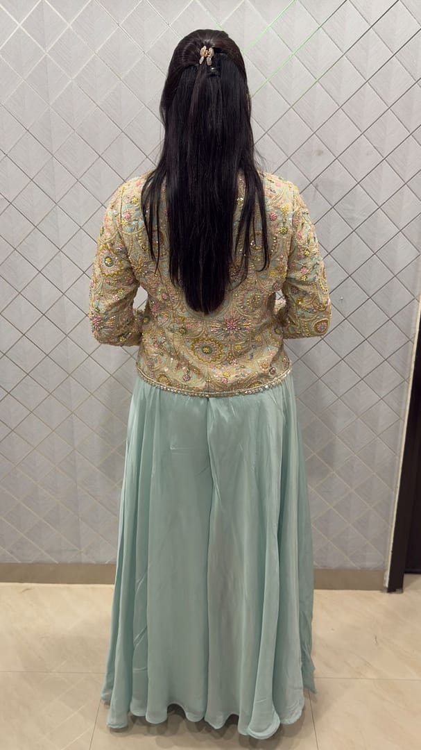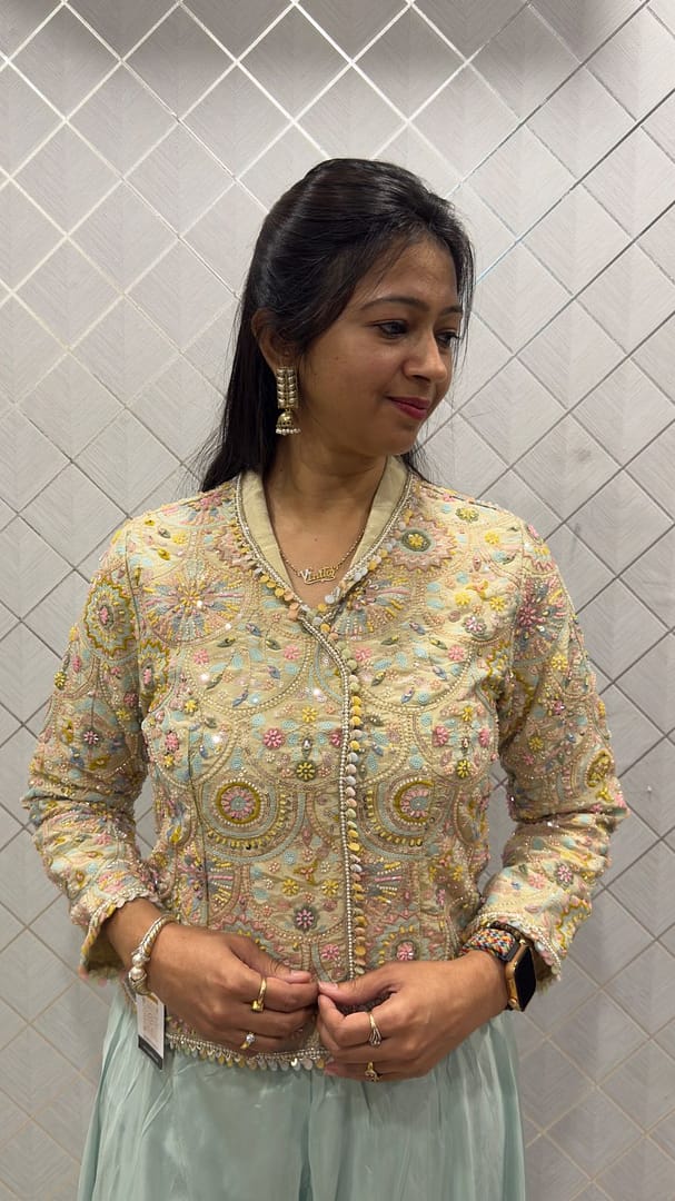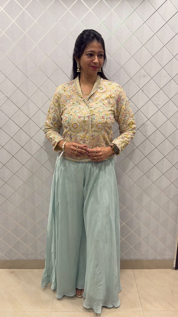 Two piece party wear design. The top is a fitted jacket-style shirt in a light pastel color. It is completely covered in heavy, intricate work using subtle multi-colored threads (pinks, blues, yellows) and shimmering beads. This detailed intrication makes the jacket the main focus. It is paired with wide-leg, flowing palazzo pants in a calm mint green color. This outfit is perfect for a festive occasion where you want a modern look with lots of sparkle and detail.