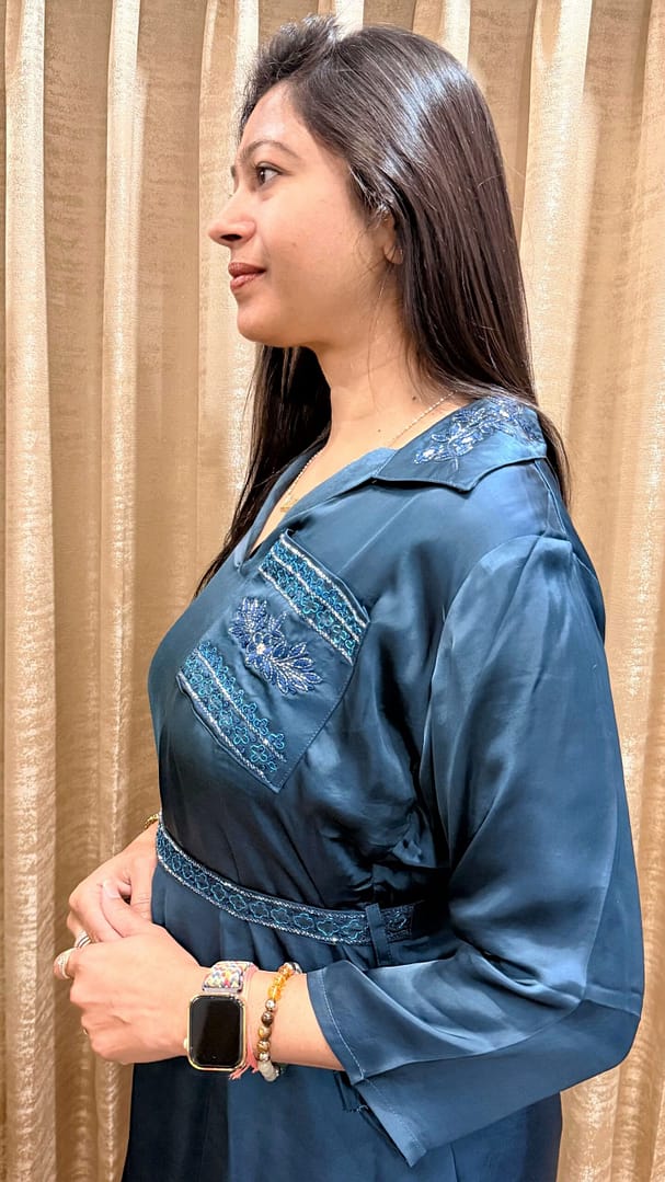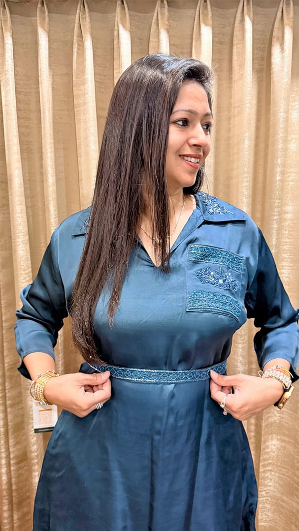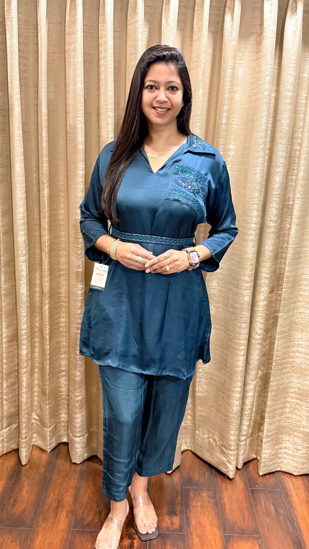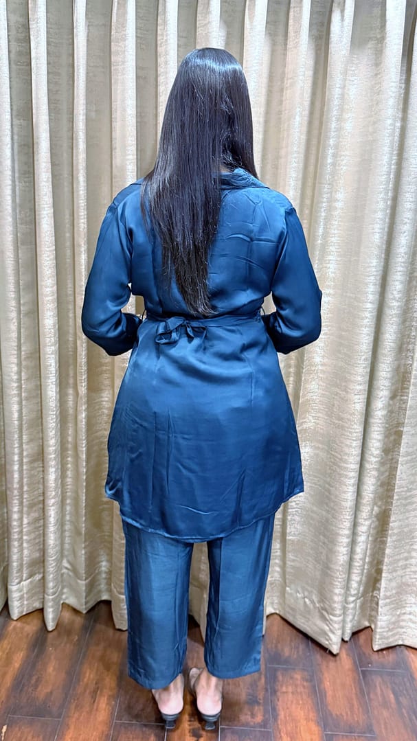 Teal blue ethnic co-ord set with a silky lustrous finish. • A short, straight-cut tunic featuring a stylish shirt-style collar and three-quarter sleeves. It is accented with a decorative pocket on the chest and a matching embroidered belt that cinches the waist.• Bottoms: Coordinating teal blue straight-leg trousers that complete the streamlined look.
