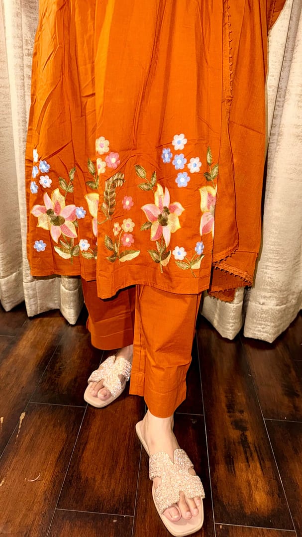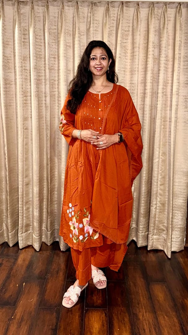 Three piece suit, mul chanderi fabric, thread work, pearl work on neck