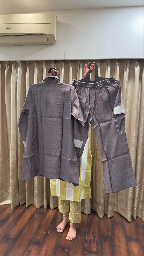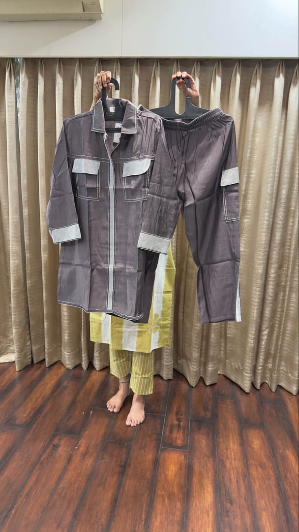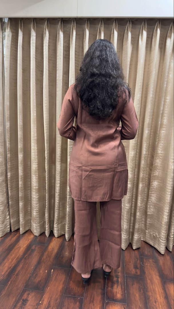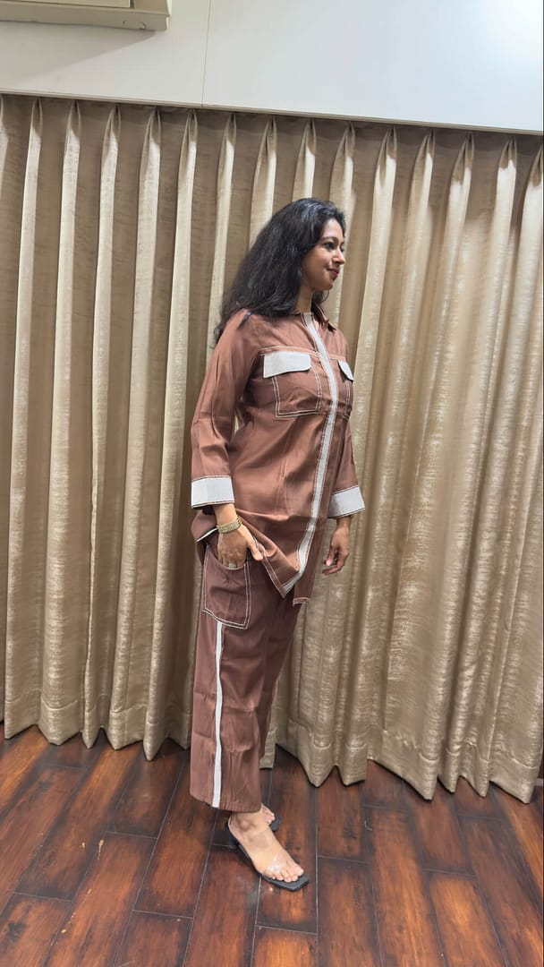 Warm coffee modern co-ord set Fabric soft cotton blend, breathable shirt style collar with western inspire look