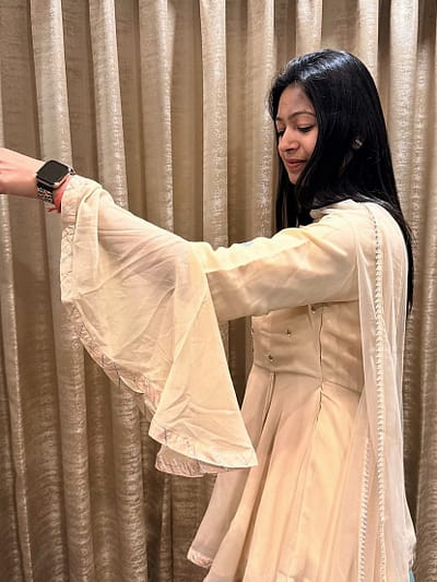 ₹1,900.00BEIGH SKINA soft beige colored ethnic ensemble with delicate light blue floral accents.A peplum-style tunic featuring a round neckline and dramatic, flared bell sleeves. It is decorated with a single large, light blue rose embroidery on the left shoulder and smaller floral motifs scattered throughout.• The Bottoms: A matching, high-waisted maxi skirt or lehenga that flows to the floor also adorned with small blue embroidered details.ORANGE SILK CO-ORD SET WITH SHRUGH