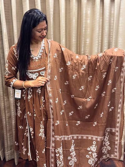 ₹1,500.00BROWNLAVENDERA brown/lavendere A-line kurta set featuring white embroidery and butterfly motifs•Design:The kurta has a gathered waist and is decorated with white floral pearl work and two prominent butterfly designs on the bodice.•Neckline: A V-neckline accented with white lace borders and delicate hanging bead charms.•Components: It is paired with matching brown trousers, a coordinated dupatta, and white pearl-embellished sliders.PURPLE BANDHANI COTTON FULL SUIT