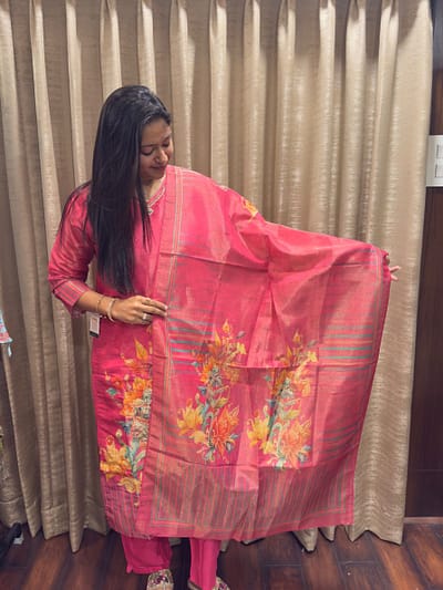 ₹2,100.00MARGENTA PINKA vibrant magenta silk kurta set featuring a bold floral print and a coordinated dupatta.The straight-cut kurta is crafted from a lustrous silk-like fabric and showcases a large, colorful tropical floral motif in yellow, orange, and green on the lower front.Completed with matching magenta trousers and a dupatta that repeats the bold floral and striped patterns.OFF-WHITE WITH GREEN DUPATTA FULL SUIT