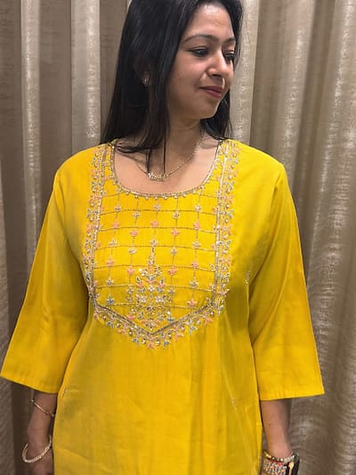 ₹1,800.00YELLOWA bright yellow three-piece ethnic outfit.• Kurta: A knee-length,straight-cut tunic with three-quarter sleeves. It intricate, light-colored floral and geometric hand work across the chest and neckline.• Bottom: Matching yellow straight-leg trousers.• Dupatta: A long, matching yellow duptta with a delicate patterned border.BROWN/LAVENDER COTTON FULL SUIT