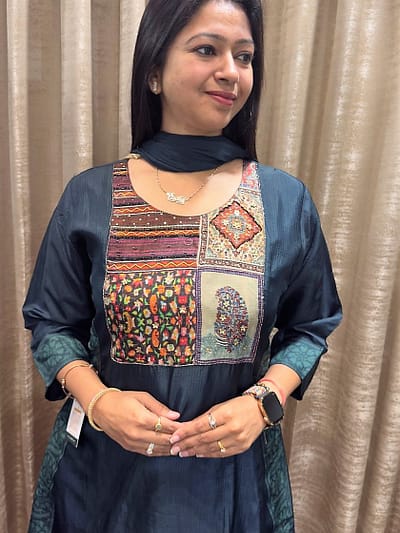 ₹1,600.00TEAL BLUEA dark teal ethnic Salwar Kameez set.•Kurta: A straight-cut tunic featuring a contrasting chest panel with colorful, multi-patterned patchwork and embroidery.• Bottom: Matching dark teal dhoti-style trousers that gather at the ankles.• Dupatta: A long, semi-sheer matching chiffon dupatta with a delicate gold beaded border.YELLOW ETHNIC FULL SUIT