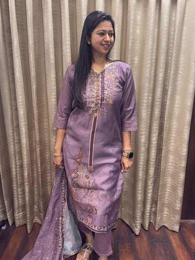₹1,850.00MAUVEmauve-colored kurta set with three-quarter sleeves.It features intricate floral sequin handwork around the neckline and a larger decorative pattern on the lower side also.• Bottom: Matching straight-cut purple trousers.• Dupatta: A long, matching purple dupatta with a patterned border.OFF-WHITE CO-ORD SET