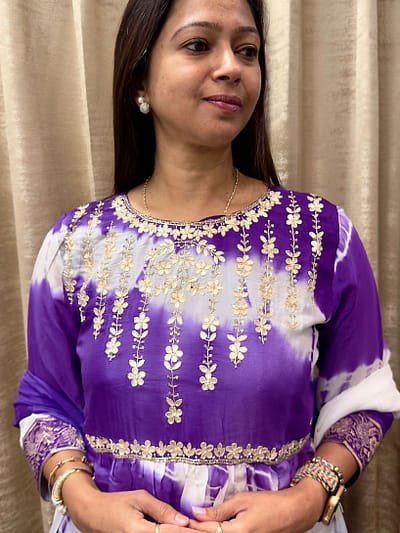 ₹1,890.00PURPLEPurple and white tie-dye set: • Top: A short kurta with a cinched waist and bold gold embroidery along the neckline and mid-section.• Bottoms: Matching tie-dye dhoti-style pants or loose trousers with embroidered borders at the ankles with pure chiffon dupatta.