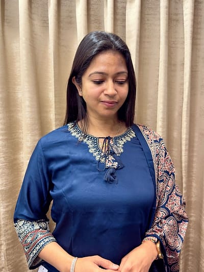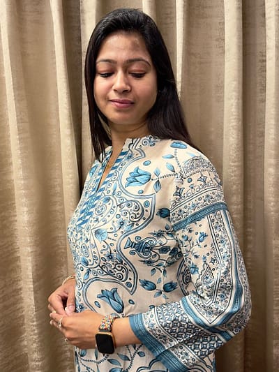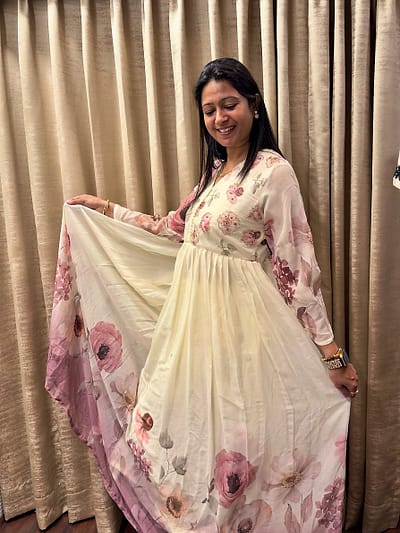 ₹1,350.00SKY BLUEknee-length cream-colored finest soft cotton featuring intricate teal and blue floral and scrollwork prints.• Bottom:Matching wide-leg trousers with a similar blue-and-white patterned design.OFF-WHITE LONG GOWN ANARKALI